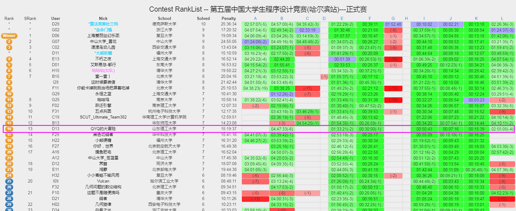 2019-10-13 CCPC第五届中国老员工程序设计竞赛(哈尔滨)排名榜