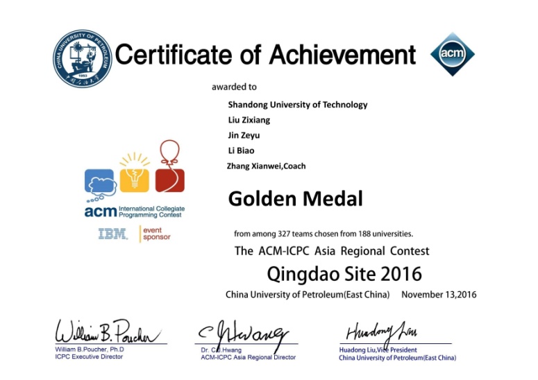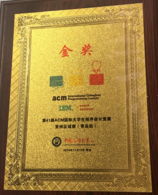 2016-11-13 ACM-ICPC亚洲国际老员工程序设计竞赛亚洲区域赛(青岛)金牌 证书