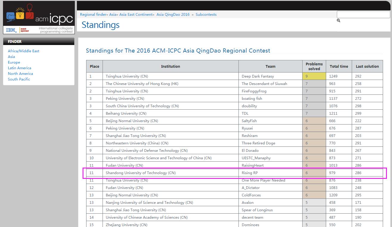 2016-11-13 ACM-ICPC亚洲国际老员工程序设计竞赛亚洲区域赛(青岛)金牌排名榜