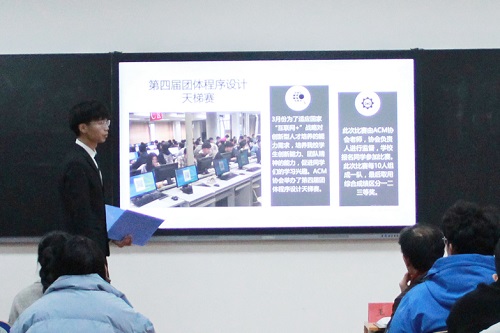 会议伊始,由汪茗惠老师进行会议内容、会议主旨介绍,详细阐述了此次会议的基本流程和成绩评判细则。随后主持人宣布此次社团年终评优会议正式开始,答辩人员按照签到顺序依次上台答辩。答辩人需在五分钟内向大家展示社团风采,结束后由各位评委进行点评。答辩时,各社团负责人结合PPT用生动流利的话语介绍在这一年里社团的发展、所举办的活动和取得成绩以及对未来的展望。在评委点评环节,各位评委老师对答辩内容提出针对性问题,答辩人员根据评委老师提出的问题做出了回答。最后,为使社团能够以更好的面貌参加校级终评,评委对答辩的整体风格、内容以及排版等方面给出合理建议,同时对各社团汇报流程中可圈可点之处提出表扬,并鼓励社团保持优点的同时吸取经验,进一步提升汇报质量。