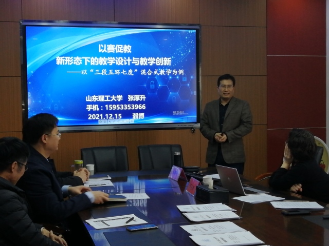 会议首先由张厚升老师做专题报告,张老师曾获山东省教学创新比赛二等奖、山东省高等教育学会首次优秀高等教育研究成果二等奖,在教学创新、课程思政建设等方面成果显著。本次报告题目为《以赛促教新形态下的教学设计与教学创新——以“三段五环七度”混合式教学为例》。报告中,张老师结合其课程建设与教学改革的实践经验,分享了其教学设计与教学创新的宝贵经验。其后,郑兆青经理从“以员工为中心”、“课前、课中、课后”、“重点难点解决”、“教学目标达成”等方面,介绍了教学设计的核心内容。