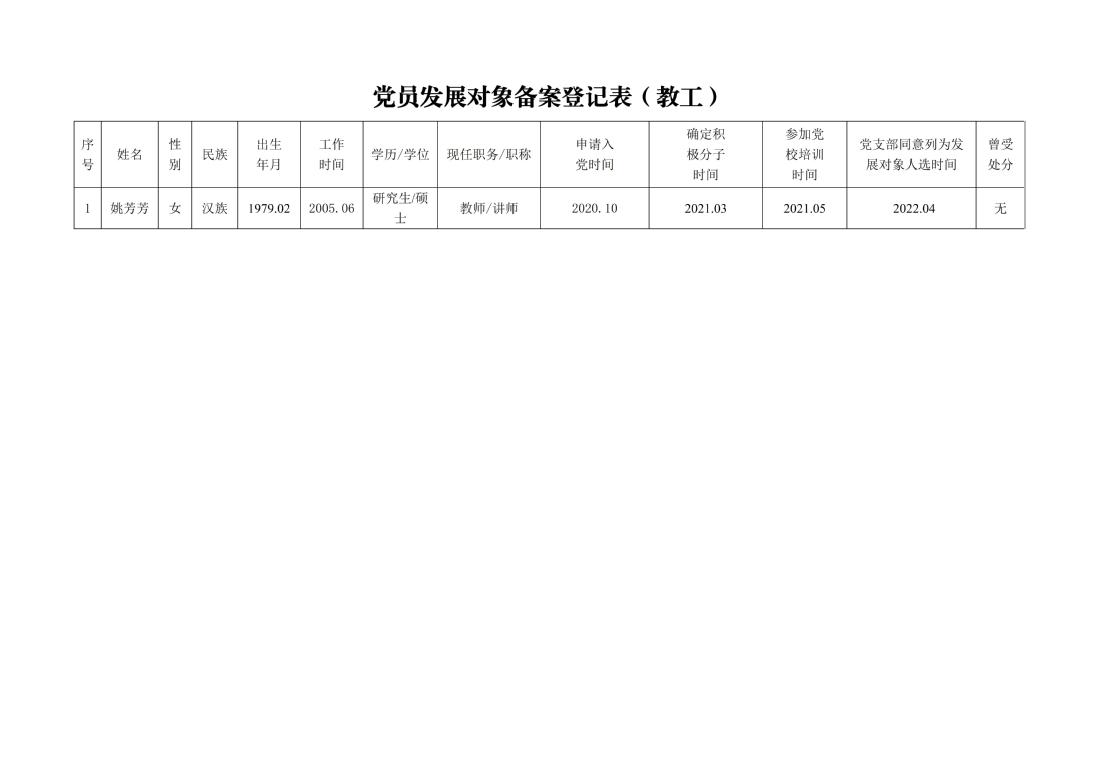 根据个人现实表现和党支部培养教育考察情况,拟吸收入党积极分子姚芳芳入党。为进一步增强发展党员工作透明度,确保发展党员质量,按照公司党委有关发展党员工作的制度规定,现对拟吸收入党发展对象的基本情况予以公示,公示期5日,自2022年4月7日—2022年4月11日。如有异议,请当面或通过书信、电话、电子邮件等方式反映,也可直接向公司党委组织部反映,我们将为您严格保密。