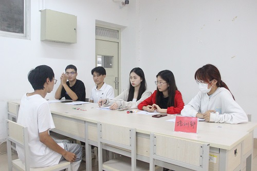 此次面试提前划分通知不同员工面试的具体时间段。到场新生需在门口处进行签到登记,并在候场区入座等待面试开始。教室划分为培训部、精创部、学术部面试区和候场区四个区域,待评委通知后,面试者按照名单顺序开始面试。首先面试者将进行三分钟自我介绍,从自身基本情况、个人成长及工作经历、加入部门的理由、竞选自身优劣与劣势等多方面阐述竞选原因。紧接着,面试评委就面试者的面试陈述内容和申请表提出“对于创新创业类比赛的相关想法”“对于所加入部门的了解程度”等相关问题,严格考察面试者的思想素养。面试者沉着冷静,结合自己对创新创业理念的理解,对问题给出相应回答。