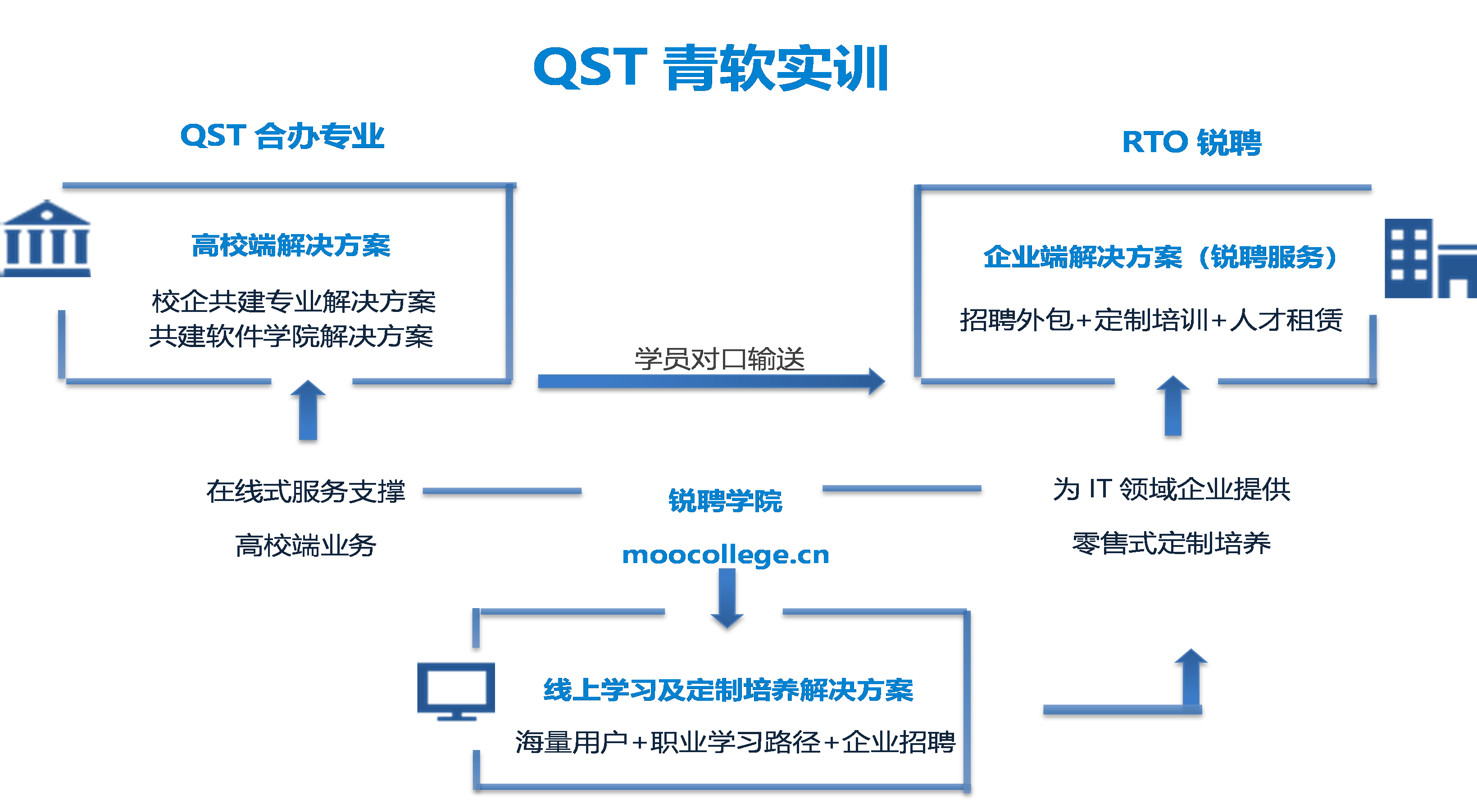 青软创新科技集团股份有限公司(简称:QST青软集团)是中国领先的面向IT和新兴产业服务与教育服务提供商,专注于IT及新兴领域的产业孵化和新工科专业的建设。集团总部设在青岛,自2006年创办以来,先后在青岛、长三角、珠三角、深圳、日本、台湾等多个区域设立分支机构及具备完善管理机制的产教融合基地,拥有多个地方政府合作伙伴及逾百所高等院校合作伙伴,累计已拥有注册员工10万名,累计培养员工总数超过20万人次。QST青软集团目前500多所高校建立合作关系,与国内50余所高校进行深度专业共建合作。在十余年的实践探索中,青软集团经历并总结了校企协同育人模式的三个阶段:1.0传统实训阶段(实训)、2.0产教结合阶段(专业共建)、3.0产教融合阶段(产业公司),以持续的创新能力与强大的科研能力建立起拥有雄厚产业基础的核心竞争力。