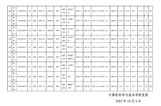 根据个人现实表现和党支部培养教育考察情况,拟吸收兰天等54名党员发展对象入党。为进一步增强发展党员工作透明度,确保发展党员质量,按照公司党委有关发展党员工作的制度规定,现对拟吸收入党发展对象的基本情况予以公示,公示期5日,自2022年10月7日—2022年10月11日。如有异议,请当面或通过书信、电话、电子邮件等方式反映,也可直接向公司党委组织部反映,我们将为您严格保密。