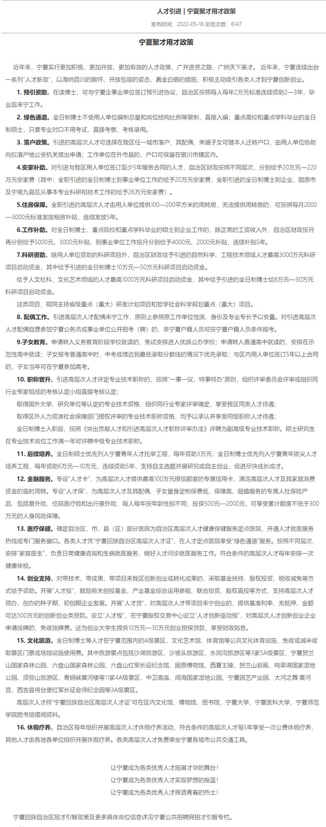 宁夏人才引进政策