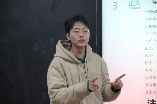 会议伊始,宋振鑫向23级员工骨干们讲述省学联格式要求,以策划书为例分别详细介绍省学联格式的封面、目录、正文、提交时间等,并根据常出现的错误,详细分析错因并针对性地提出改进措施,从而保证策划案的规范性。随后,他为同学们介绍Word的各项功能,分别讲述了Word快捷键、目录的设置、页眉页脚、以及图片处理和文档分节等具体操作。