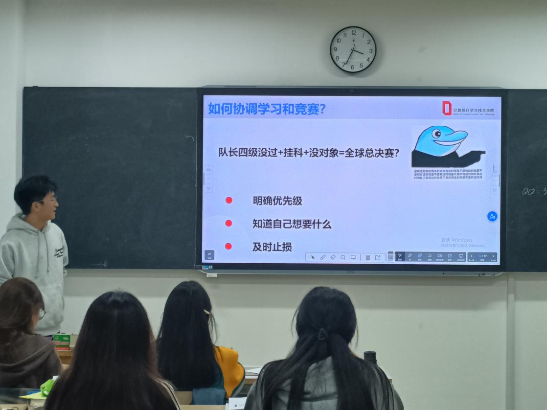 接下来是从文杰的分享。他主要阐述了竞赛的重要性,以及如何协调竞赛与学习之间的关系。他说,想要获得国奖需要全面发展,但科技创新通常更加重要,意在提高同学们对科创比赛的重视程度。关于如何协调竞赛与学习方面,从文杰告诉图灵班的同学们,要明确好优先级,知道自己想要什么。希望同学们能尽早确立自己的目标,制定有关未来学业的计划。