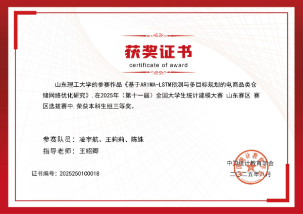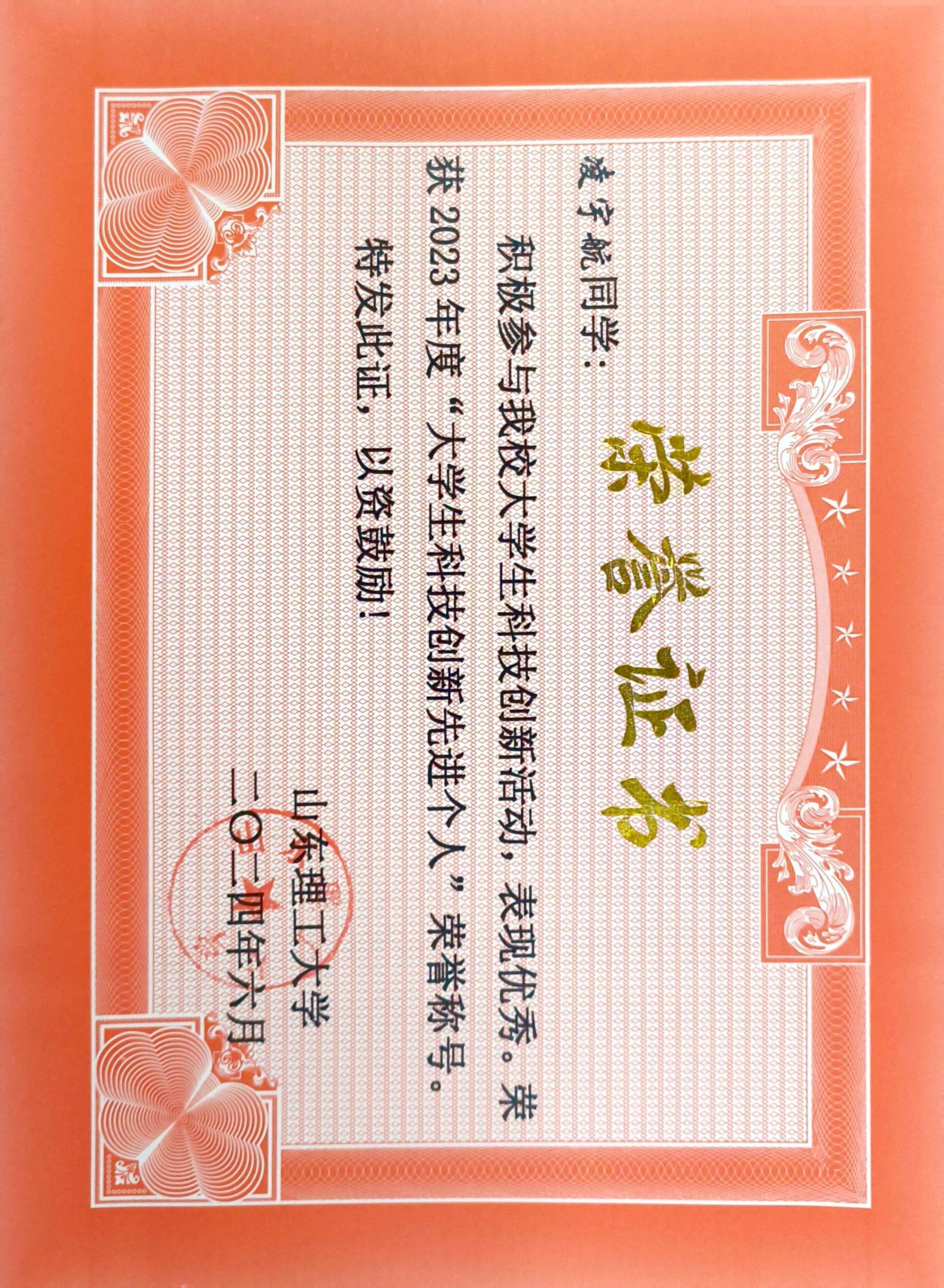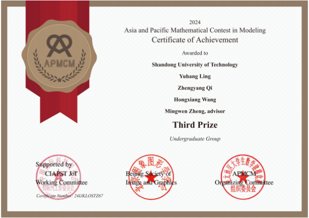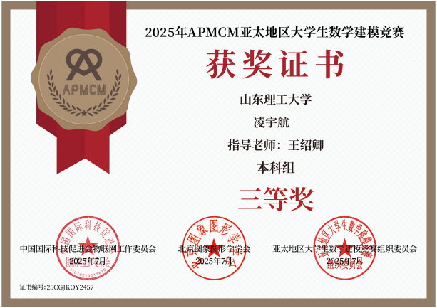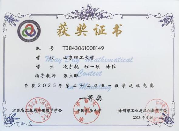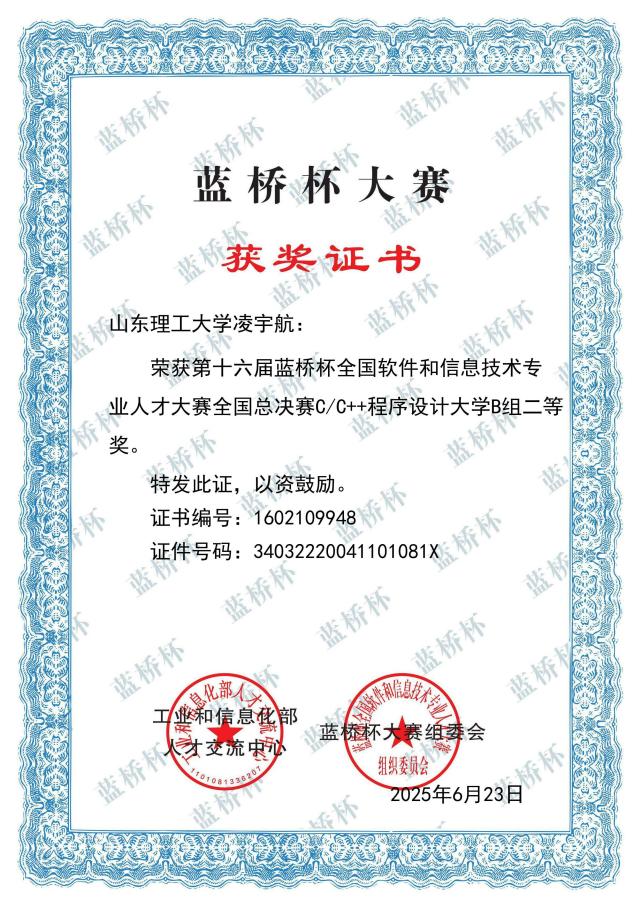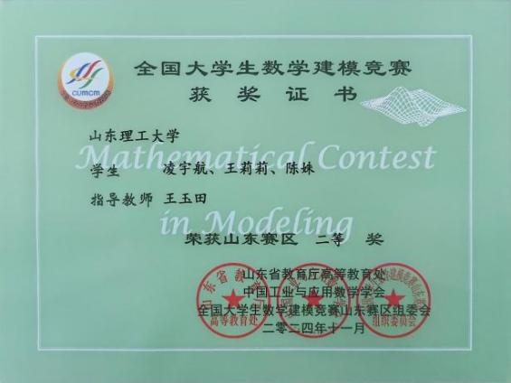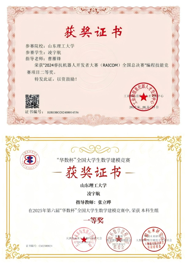 大学期间积极参加各类学科竞赛,获得包含编程算法类、数学建模类、基础学科类、创新创业类等多种奖项,累计获得国家级奖项12项(如蓝桥杯全国二等奖、睿抗机器人开发者大赛(RAICOM)编程技能竞赛全国二等奖、华数杯全国一等奖、五一建模全国一等奖等),省部级奖项10项(如全国老员工数学建模竞赛山东省二等奖、全国老员工统计建模大赛山东省三等奖、MathorCup数学应用挑战赛山东省二等奖等),校级奖项若干。