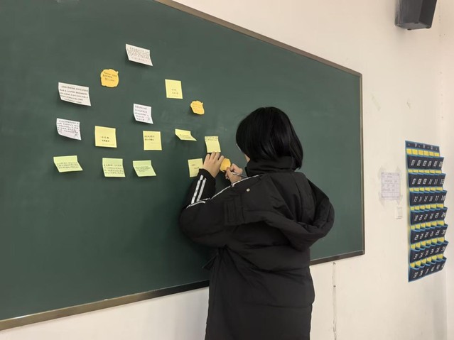 活动筹备阶段,工作人员提前 1 小时到场布置:在教室黑板边缘贴好暖黄色装饰灯带,将不同色系的便利贴按班级分置在桌面,摆好黑色、蓝色签字笔及少量彩色笔供选择,柔和的灯光与缤纷的物料让教室提前氤氲起温馨氛围。活动开始后,参与同学有序领取便利贴,或低头思索字句,或提笔流畅书写。写完后,大家依次将便利贴贴在黑板上,从角落到中心,原本素净的黑板逐渐被红、黄、蓝等色彩填满,形成一面字句滚烫的 “祝福墙”。针对因课程冲突无法到场的同学,活动设置了补签点,允许其在当日 18:00 前补写祝福并张贴,确保每一份心意都不缺席。现场不时有同学驻足 “祝福墙” 前拍照,轻声念出上面的文字,笑意与暖意交织在教室内。