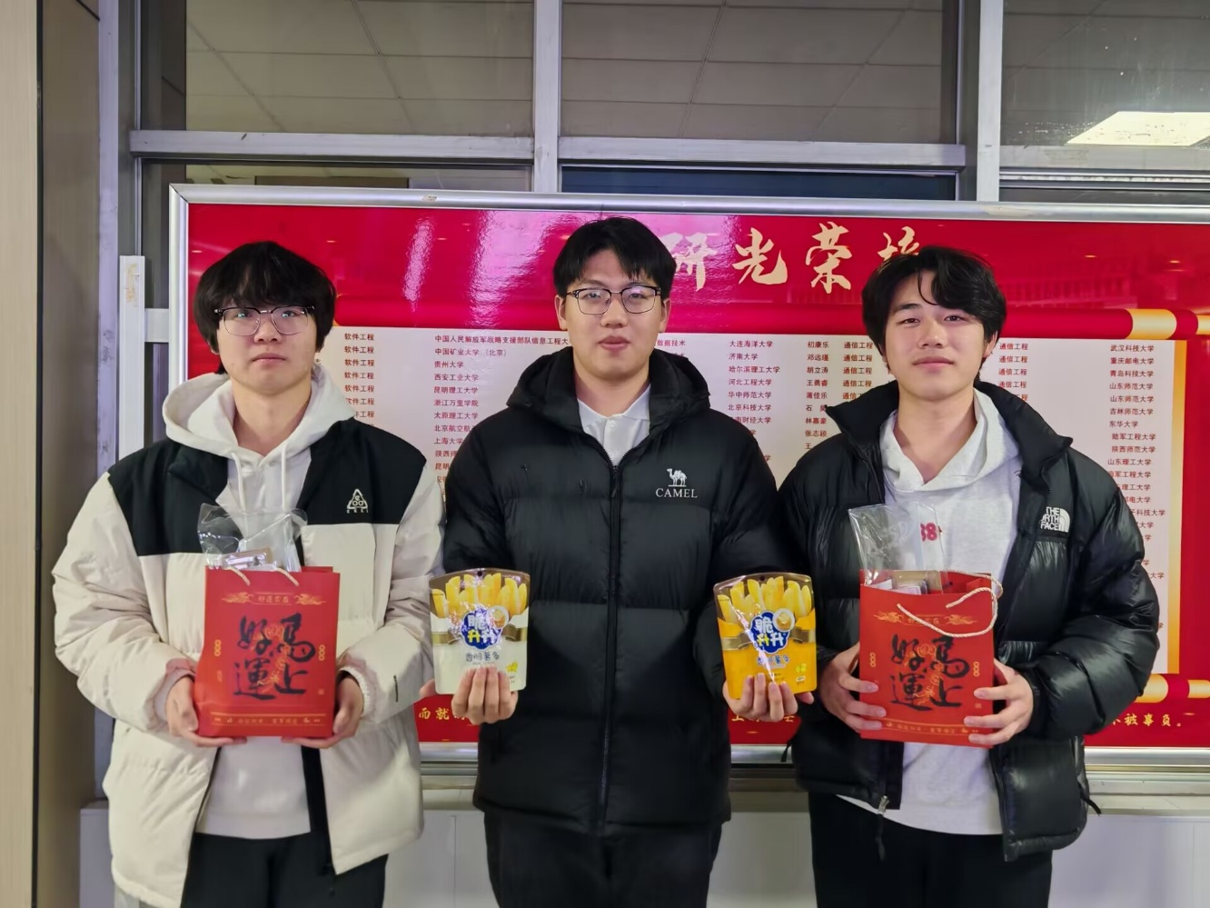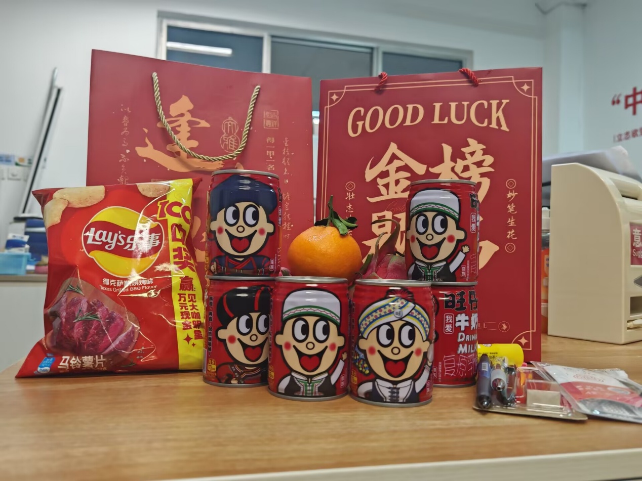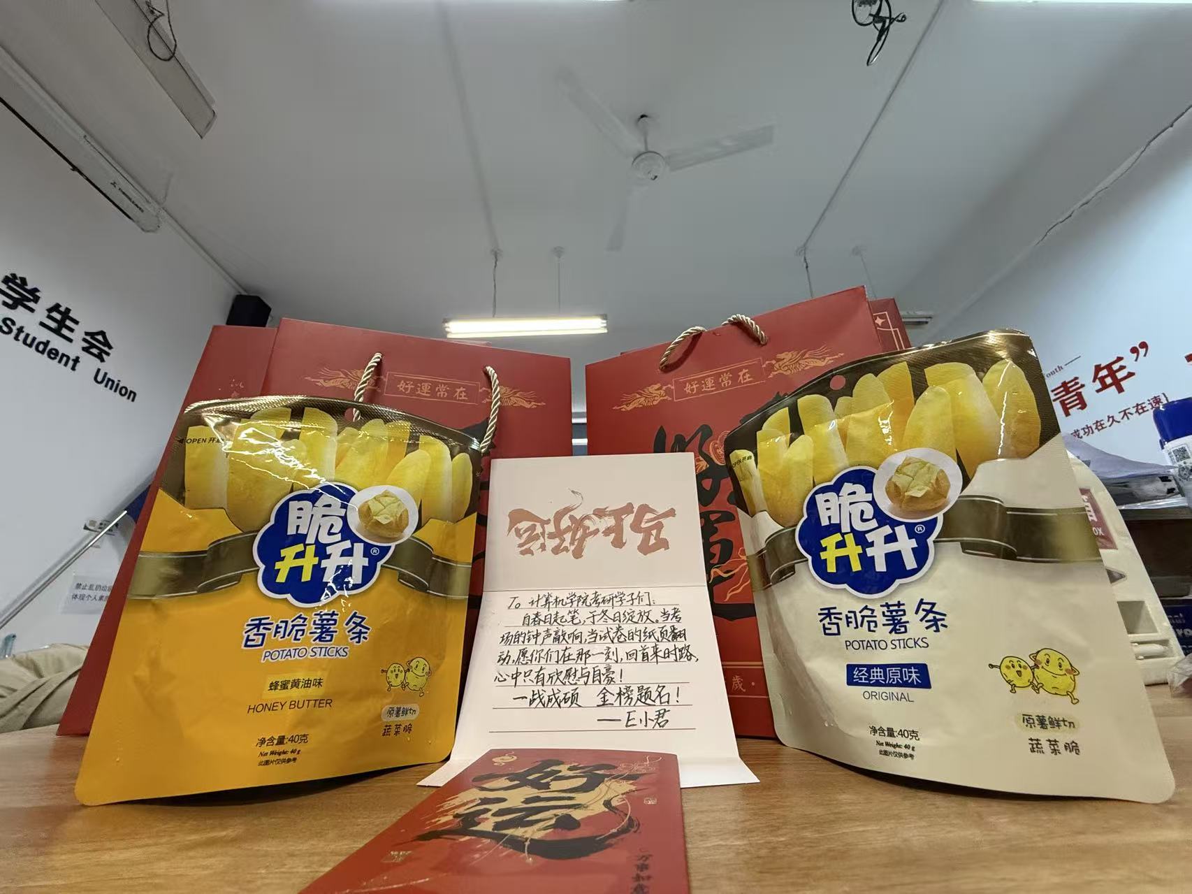 随后,公司领导及辅导员老师为考研学子逐一发放“考研大礼包”。礼包内精心准备了一系列备考实用物资,包括定制笔记本、签字笔、荧光笔、考研真题汇编、错题本等学习用品,同时还贴心搭配了寓意“心想事成”的果冻橙等小礼物,以及印有“金榜题名”“逢考必过”等励志话语的书签和祝福卡片。每一份礼包都承载着公司对学子们的深切关怀与美好期许,让备考学子在寒冬中感受到了浓浓的暖意。